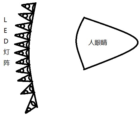 為了解決由于距離近無法看清圖像的問題,我利用用凸透鏡把每個LED燈的光線都由發散光聚焦,但并不是聚焦為平行光,而是仍略有發散,使人眼能夠看清圖像。這樣做的目的是防止不同使用者戴眼鏡位置不同而可能發生的看不清圖像的問題。如圖:
