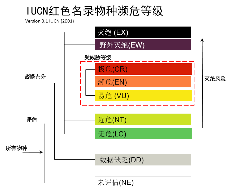 IUCN自20世紀(jì)60年代成立之日起,就設(shè)立了物種生存委員會(SSC),開始編制和印刷《IUCN瀕危物種紅皮書》,后來隨著評估物種的增加,印刷版逐步發(fā)展為網(wǎng)絡(luò)版的《IUCN瀕危物種紅色名錄》,定期編制發(fā)布。IUCN/SSC研究制定了《IUCN物種紅色名錄瀕危等級和標(biāo)準(zhǔn)》,根據(jù)物種的種群數(shù)量和分布情況等,評估其生存狀況,確定其瀕危等級。IUCN瀕危物種等級標(biāo)準(zhǔn)分為“有評估數(shù)據(jù)”和“數(shù)據(jù)缺乏”兩類,“有數(shù)據(jù)評估”中又分為“滅絕”、“野外滅絕”、“區(qū)域滅絕”、“極危”、“瀕危”、“易危”、“近危”和“無危”等8個級別,從“無危”到“極危”,滅絕風(fēng)險逐步上升,瀕危等級逐步增加。瀕危等級標(biāo)準(zhǔn)有5個指標(biāo),分別是種群下降、有限地理分布區(qū)、下降小種群、非常小或非常有限的種群、以及模型模擬等量化分析,根據(jù)這些指標(biāo)的數(shù)量閾值,來評估物種的瀕危等級。