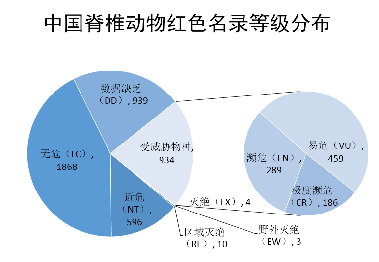 2015年完成的《中國生物多樣性紅色名錄-脊椎動物卷》,共評估了中國4357種脊椎動物,包括673種哺乳類,1372種鳥類,461種爬行類,408種兩棲類,1443種淡水魚類。其中939種數(shù)據(jù)缺乏,1868種無危,596種近危,受威脅的物種共934種。在934種受威脅物種當(dāng)中,易危459種,瀕危289種,極度瀕危186種。受威脅的原因分析中,過度利用、生境喪失和人類干擾是最主要的威脅因子。
