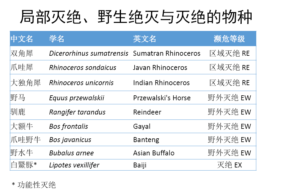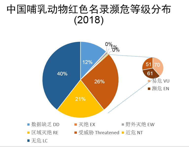 此外,我們對中國哺乳動物多樣性進(jìn)行編目,分別于2015年和2017年完成了第一版和第二版,第一版中,我們收錄了673種哺乳動物,第二版中我們刪除了一些不存在的物種如倭巖羊,并增添了一些物種,主要是分布在藏南的一些物種,共收錄了693種哺乳動物,使得我國的哺乳動物總數(shù)位列全球首位。2015年發(fā)布《中國生物多樣性紅色名錄-脊椎動物卷》后,2018年又對該紅色名錄等級進(jìn)行了更新,哺乳動物的情況來看,最新的評估結(jié)果中,受威脅的物種占26%、近危21%,無危40%,數(shù)據(jù)缺乏12%,其中有多個物種已經(jīng)區(qū)域滅絕、野外滅絕或功能性滅絕。部分中國特有的哺乳動物,中國生物多樣性紅色名錄和IUCN紅色名錄的評估結(jié)果,由于評估信息的不同,結(jié)果也有所不同,如白鱀豚、長江江豚等;還有一些哺乳動物由于并非中國特有,所以中國生物多樣性紅色名錄和IUCN紅色名錄評估等級有所不同,如野馬、賽加羚羊、麋鹿、蒙原羚、河貍等。