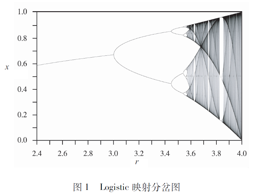 例如,當r=2.5時,Logistic映射的穩態很簡單,就是一個不動點,也稱為周期一點。如果:再增加,比如增加到2. 9,這時穩態依然還是個不動點,和r=2.5時的穩態對比,穩態行為并沒發生性質的變化。進一步增加到3. 0時,會發現穩態還是個不動點,但這時候與2. 9時有一點變化,這時映射處于一種臨界狀態,如果參數r再增加一點就無法觀察到之前的不動點穩態行為,所以我們認為在r=3.0處Logistic映射發生了分岔現象。進一步增加參數r到3. 1時,就會發現穩態已經不是不動點或周期一,而是周期二了。周期二就是指穩態行為在兩個點之間來回的振蕩。進一步增加r到3. 45時,映射又進人了周期二的臨界狀態,當然我們認為這時也發生了分岔現象。進一步增加r我們還可以觀察到周期四穩態,即在這四個點之間來回振蕩形成一個完整的軌道。剛才我們已經觀察到周期一到周期二的倍周期分岔以及周期二到周期四的倍周期分岔,隨著r繼續增加,我們還可以進一步地觀察到倍周期分岔,如周期四到周期八、周期八到周期十六、周期十六到周期三十二等等。顯然,隨著倍周期分岔的持續發展,映射穩態將呈現越來越大的周期態,這個周期態在極限情況下周期將無窮大,就變為了一個非周期行為,我們稱之為混沌態,這就是非線性動力學中典型的倍周期分岔通向混沌的路徑。通過這個Logistic映射的例子,我們簡單地認識了一下什么是分岔。分岔其實從定義上來說很簡單,它就是指當系統參數改變時,動力學系統定性行為發生變化的一種現象。分岔描述的是系統隨參數變化的動態現象,不同類型的分岔其細節也不一樣,我們可以進一步地定義不同的分岔現象,因為時間原因這里就不給大家詳細展開了。