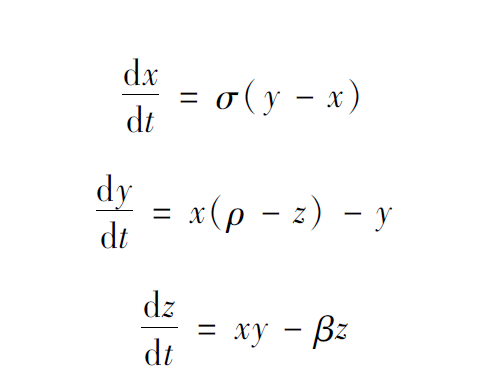 剛才講的Logistic映射是一個離散動力系統,下面給出一個連續動力系統的例子,該系統非常有名,叫作洛倫茲系統,是1969年洛倫茲在研究氣象模型時提出的: