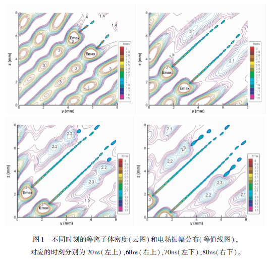 下面看一下相交微波束大氣擊穿的模擬結果,我們首先算了同頻率微波相交的情況,此時相干疊加之后,由于干涉作用,會形成電場強度強弱分布。我們首先模擬一下種子電子在弱場區的情況。因為在大氣中種子電子是偶然出現的,有可能出現弱場區,如果出現在弱場區,它需要擴散,擴散到強場區之后電子碰撞分子發生雪崩電離,形成的等離子體沿著強場區做趨源運動,運動方向沿著)=:的這條線。形成的等離子體的區域是一個等離子體絲帶,當然如果把氣壓降低,會發現絲帶就會過渡為一個等離子體帶。圖1給了幾個典型時刻的等離子體密度分布和場強的分布,在20ns的時候,由于靠近等離子體區域最強的場是沿著)=:這條線的,當等離子體絲帶長度增加到一定程度的時候,在其左上和右下區域,相當于把兩個微波場隔開,這兩個區域相當于只有一個單微波的作用,在兩邊有新的等離子體絲帶。如果初始電子出現在強場區,電子碰撞分子就會雪崩電離,形成等離子體。等離子體區域也是沿著J=:這條線做趨源運動。下面簡單比較了同頻和非同頻微波相交的大氣擊穿,同頻相當于相干疊加,非同頻相當于非相干疊加,模擬時間都是80ns,初始的種子電子數都一樣,可以發現在相干的情況下,即使把種子電子源放到場強最小的地方,產生等離子體的區域也大于非相干的情況,而且產生的最大電子數也是大于非相干的情況。總結主要有三點,一個是區域隨壓強的變化,還有等離子體做趨源運動,還有相干比非相干的等離子體區域比較大。
