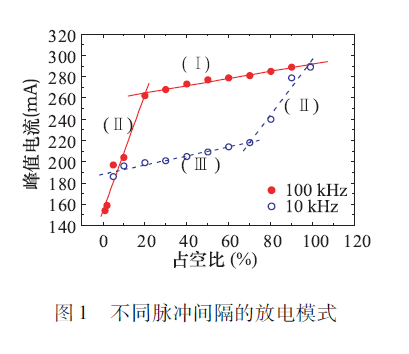 如果兩個脈沖間隔比較近,那么跟連續就沒什么差異,因為脈沖撤銷以后,即射頻消失以后,電極間還存在的空間電荷,也就是有電子和離子分離存在,這些電子在第二脈沖上來后就會參與放電,這時與連續放電差異性就不大了。如果脈沖間隔范圍足夠寬,這就成為兩個不同的放電,兩個放電之間是不相關的。如圖1( I)是脈沖之間間隔非常小的時候,稱為連續模式;下面的Ⅲ是脈沖之間間隔非常大的時候,稱為分離模式,我們可以看到整個放電的峰值電流要小不少。在它們之間,(II)稱為傳輸模式,在兩個脈沖之間,電子沒有完全消亡的情況下放電電流與占空比的關系。共有上述三個過程,可見脈沖的間隔長短對放電的影響不是由占空比決定,主要是考慮電極之間間距和里面所參與的空間電荷分布變化。